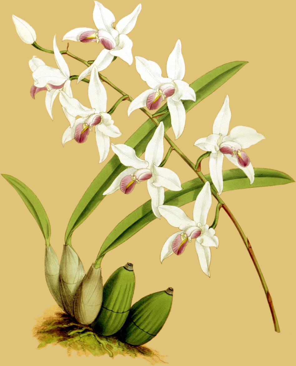 Dendrobium Linawianum is an evergreen species with flattish club-shaped stems, which are of a light green colour, and remarkable for becoming swollen just beneath the nodes. The leaves are of a pea-green colour, and the flowers are borne on the stems of the second year, in twos or threes at every node. The sepals and petals are white at the base, and bright rosy pink in the upper half, while the lip is white, beautifully tipped with bright magenta-crimson. The flowers are produced during the winter and spring months, and last in perfection for two or three weeks. It may be had in flower much later by retarding the plant after it has finished its growth.