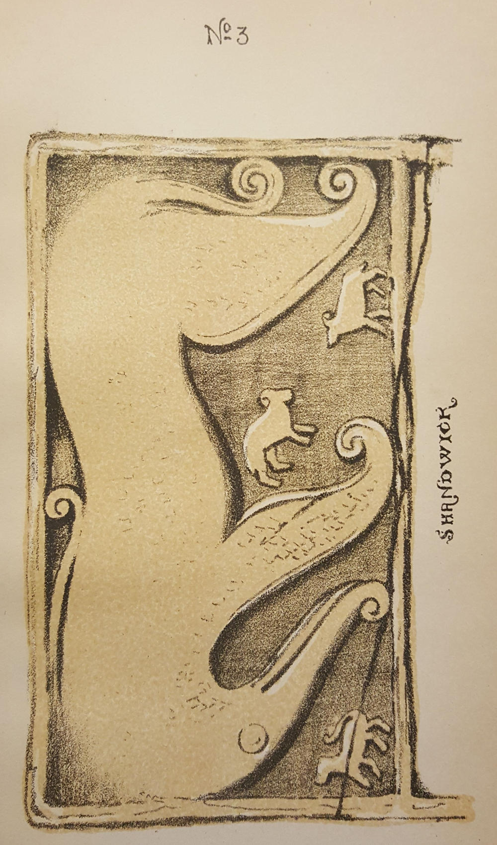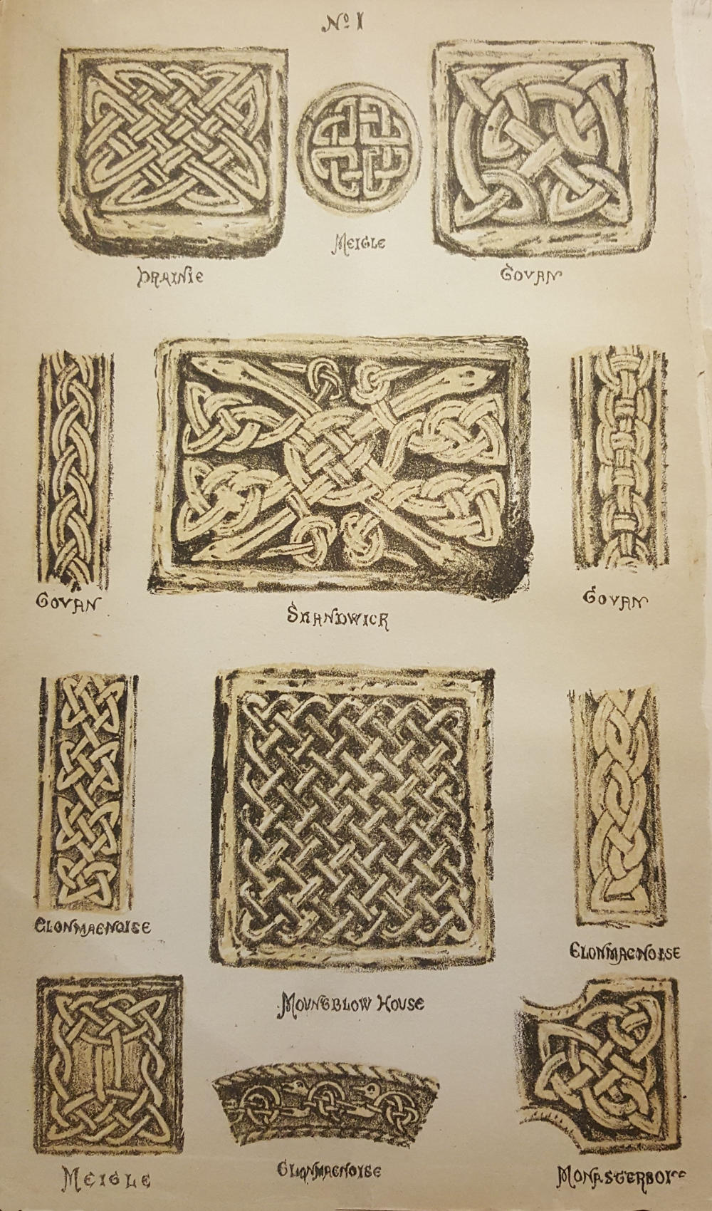 The style of interlaced ornament to which I refer is found in an infinite variety of devices on the earliest sculpture, whether of stone or metal, and in the oldest manuscripts and illuminations of Britain and Ireland. It retained its peculiar distinctive character throughout the Roman occupation of Britain, slightly modified by, and often mixed with, classical ornaments. These, however, in a great measure disappeared during the Saxon period, a circumstance which induces the belief that, whatever its origin and purpose, interlaced ornamentation was equally familiar to the Saxon invaders and to the British aborigines. It entered largely into Norman[4] architecture; but from the time of the Conquest it gradually became less used, though traces of it are to be met with at nearly every period in the history of British art. Thus it was revived with the introduction of printing, when many beautiful capital letters, copied from ancient manuscripts, were reproduced as wood-cuts. It reappeared in the strap-work peculiar to the architecture and ornamentation of the Elizabethan and Jacobean eras. It is found in the bone-lace patterns of this country and of Northern Europe in the sixteenth and seventeenth centuries, and was retained in almost its original purity for the decoration of the dirks, targets, brooches and powder horns of the Scottish Highlanders within the last hundred years.[1]