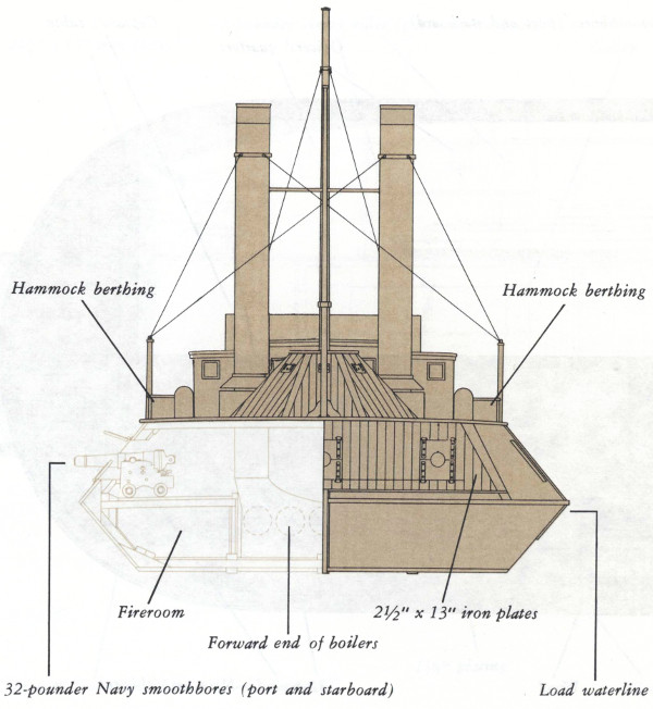 It was mid-summer before Eads noticed advertisements in St. Louis newspapers inviting bids to build the gunboats. According to the specifications, the vessels were to be 175 feet long, with a 50-foot beam, and to draw 6 feet of water. They would have flat bottoms, with three keels, and an oblong casemate sloping up to a flat spardeck, 45° in front and 35° on the side. The forward end was to be pierced for three guns, the port and starboard beams for seven guns each, and the stern for three guns. (As built, however, there were four ports on each side of the casemate, three on the forward face, and two on the after face.)