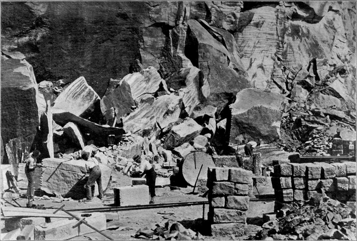 Aus diesen Teichsteinbrüchen stammen unter anderen die zwölf Säulen zu dem neuen Gebäude der Kunstakademie auf der Terrasse, jede dieser Säulen hat eine Höhe von 8 m. Zu dem Neubau am Königlichen Schlosse zu Dresden wurden aus denselben Brüchen auch zwei Blöcke geliefert, die jeder 638 Zentner wogen. Aus den Postelwitzer Steinbrüchen stammt der weiße Stein zu den Schillingschen Figurengruppen an der Terrassentreppe. Überhaupt sind alle monumentalen Bauten in Dresden: die Augustusbrücke, die Frauenkirche, katholische Hofkirche und Kreuzkirche, nicht minder der Zwinger und das Hoftheater aus Sandstein gebaut. Der Stein von Cotta eignet sich wegen seiner Feinheit und Weiche besonders zu größeren Luxusbauten und hat daher ein Absatzgebiet, das weit über Deutschlands Grenzen hinausgeht. So wurde 1738–1742 auch das königliche Schloß in Kopenhagen aus solchem Sandstein errichtet. Der Cottaer Bildhauersandstein, mit gleichmäßig feinem Korn, läßt sich leichter bearbeiten, ist aber auch leicht zerstörbar. Im Gottleubatal von Goës bis Klein-Cotta und Dohna werden in Steinsägewerken die Blöcke in Platten und Säulen[S. 146] zerschnitten und finden ihren Absatz über ganz Norddeutschland bis Schleswig-Holstein und Ostpreußen. Ihre Abfuhr erleichtern die beiden in Pirna einmündenden Zweigbahnen von Berggießhübel und Groß-Cotta. Der Poster Stein und der Teichstein werden wegen ihrer großen Härte und ihrer Widerstandsfähigkeit besonders zu Wasser- und Bahnbauten geschätzt. Härteres Material, gröberes Korn und größere Tragfähigkeit rühmt man an dem Liebethaler Stein, er wird daher zu Mühlsteinen verwandt. Der Stein aus den Kirchleiten bei Königstein ist dagegen wegen seiner großen Dichte zu Trögen in den chemischen Fabriken beliebt. So sieht man auch an der verschiedenen Verwendung des Quadersandsteines, wie verschiedenartig das Gestein in den einzelnen Teilen des Gebirges ist.