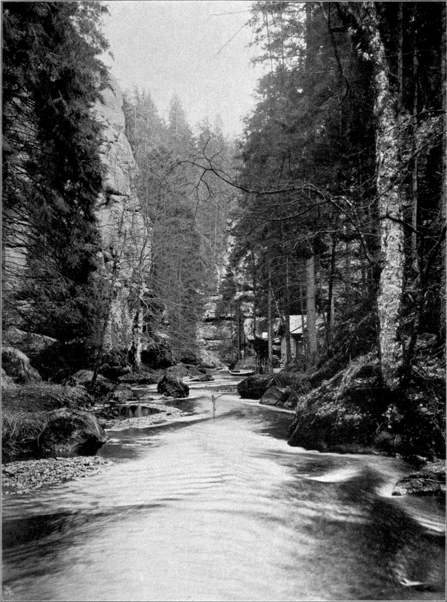 Eingebettet zwischen dem Erzgebirge und dem Lausitzer Gebiet, viel jüngerer Bildung als die gewaltigen Massen des Urgesteins zu beiden Seiten, bilden die Landschaften an der Elbe eine Lücke in dem böhmischen Gebirgsringe und in dem großen hercynischen Gebirgszuge; und durch diese Lücke hat auch die Elbe die beiden Nachbarländer in eine natürliche Verbindung gebracht und Böhmen nach Sachsen und weiter nach Norddeutschland geöffnet. Keilförmig erstreckt sich das Gebiet von[S. 5] Südost nach Nordwest in der angegebenen hercynischen Richtung und ähnelt dem ganzen Gebirgssystem um so mehr und gewährt in seinen horizontalen Umrissen insofern ein kleines, aber getreues Abbild des großen Ganzen, als sich der Keil nach Nordwesten verjüngt, und die östlichen und westlichen Grenzen, die durch den Fuß der Lausitz und des Erzgebirges gegeben sind, am nördlichen Abschluß des Talbeckens sich bereits bis auf 6 km einander nähern, während die Breite des Sandsteingebiets im Süden der Sächsischen Schweiz vielleicht 36 km betragen mag.