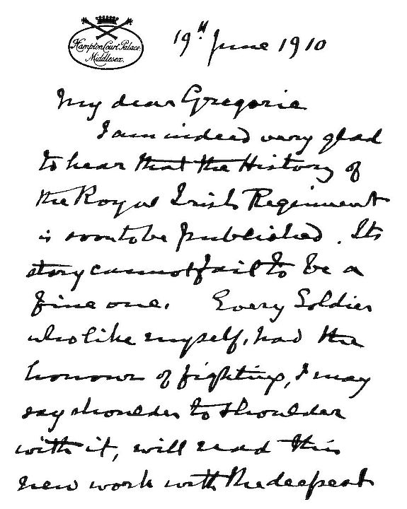 My Dear Gregorie,—I am indeed very glad to hear that the History of the Royal Irish Regiment is soon to be published. Its story cannot fail to be a fine one. Every soldier who like myself, had the honour of fighting, I may say shoulder to shoulder with it, will read this new work with the deepest interest.