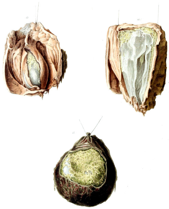 Some of these quasi-membranaceous wrappings are generally entire at one of the extremities of the mass, and open at the other, while two of the innermost are open at both ends, as if their organization had been checked by the supervening of another and external coating. This is properly marked by the artist on the second membrane, reckoning from the outside covering.