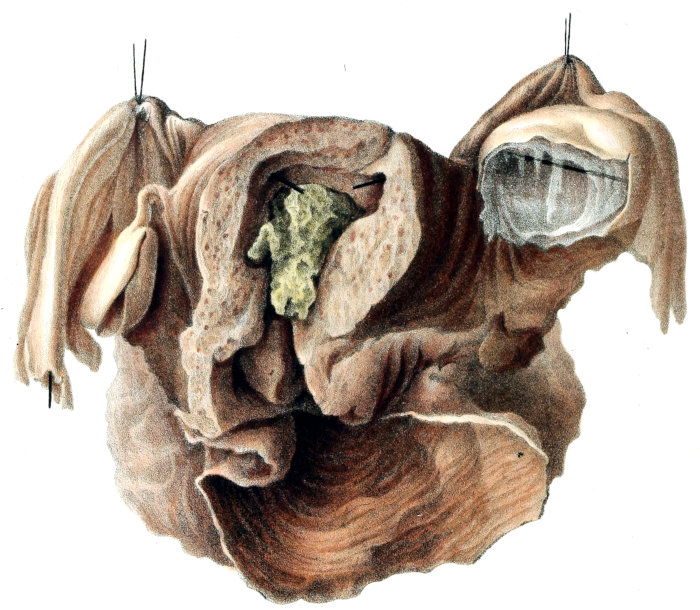 48Internally it exhibits an oblong cavity, corresponding in figure, relative breadths, and length to the containing mass, which looks like a thick coagulum at the sectional edges. This cavity, however, is not a mere hollow in the general mass, but looks like an oblong membranous pouch imbedded in that mass. Its interior is lined by an exquisitely delicate and almost fumiform pellicle—lactescent or opalescent. The pointed extremity of this cavity loses itself in the brilliantly red mass of the tapering end of the mole, at neither of whose extremities is there the least semblance of any aperture.