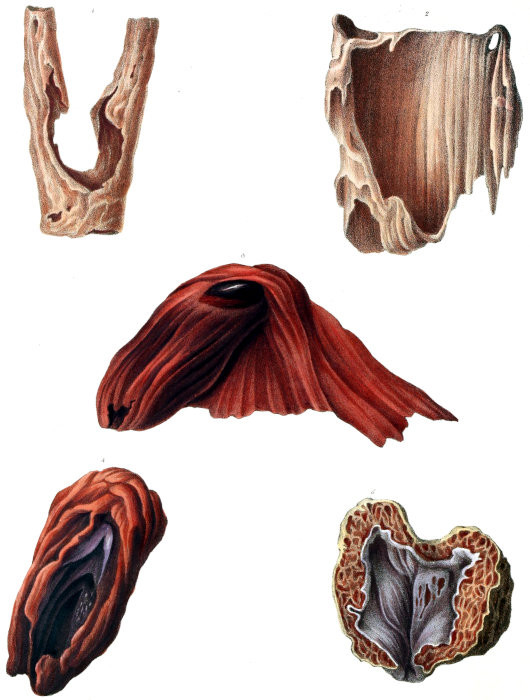 Over the latter another coat is thrown, likewise open, the margins of whose aperture do not reach those of the inner coat. Over these again arrange themselves one, two, three, and sometimes more stratifications of grumous blood, bearing a nearer resemblance to fleshy laminæ than to membranes. Their colour is of a bright vermilion, whereas that of the two innermost coats is of a dark violet, while the central cavity itself has a perfectly dark tint.