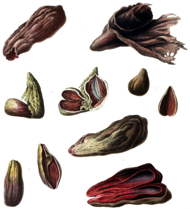 The colour of the latter is most brilliant, and has been well and correctly represented by Mr. Perry, from nature. The former, or inner layer, is darker in places, not so gelatinous in appearance, more distinctly striated, and puckered up superficially into slender longitudinal ridges, giving it the 43semblance (in form though not in colour) to a dry Egyptian date, or a very ripe banana.