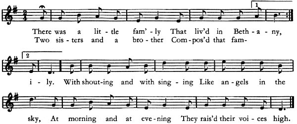 The religious ballads by and large are folk-produced beyond any reasonable doubt. They are uniformly songs for individual singing, not for groups. The sung story was the thing. In one ballad it would be the story of some bad woman, Wicked Polly for example, “who died in sin and deep despair” and went to hell; in another, of some good woman, the Romish Lady for instance, who was burned at the stake for espousing the Protestant cause. Much ballad material was furnished also by the Bible. Scriptural events like the curing of the man sick with the palsy, the restoring of sight to blind Bartimeus, Daniel’s experience in the lions’ den, the raising of Lazarus, the baby Moses in the rushes, the Prodigal Son parable, the birth of Christ, His crucifixion and death,—all are retold in the ballads.