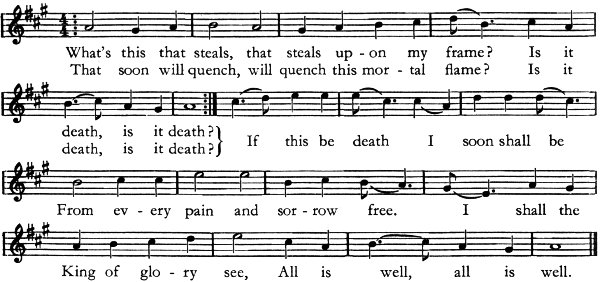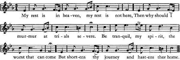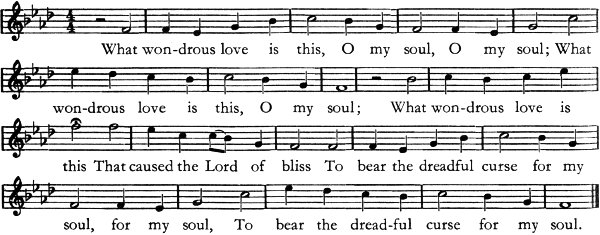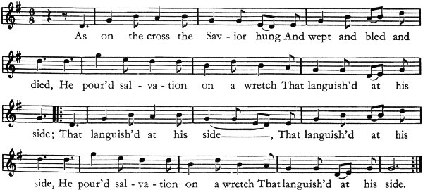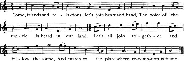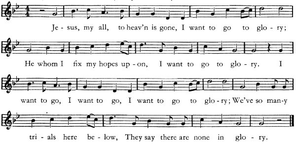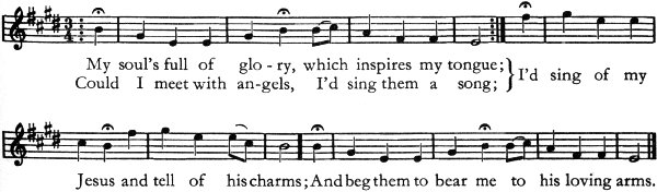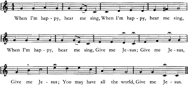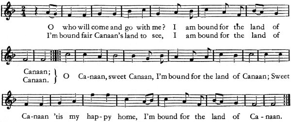 Bearing all this in mind it is perhaps easier to understand how the folk-hymns—grown up in a less boisterous environment—failed to satisfy the new conditions. At the camp meetings it was not a question of inducing every one to sing, but of letting every one sing, of letting them sing songs which were so simple that they became not a hindrance to general participation but an irresistible temptation to join in. The tunes of the folk-hymns were adequate. But the texts (Watts, Wesley and their schools) still demanded a certain exercise of learning and remembering which excluded many from the singing. The corrective lay in the progressive simplification of the texts; and it was in the main this text simplification which brought about and characterised the type of camp-meeting song which was called, in contradistinction to all other types, the spiritual song.