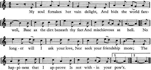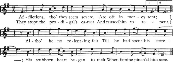In the seventeenth and eighteenth centuries the Puritan congregations of New England are said to have had music committees one of the chief duties of which was to go among the folk and gather attractive melodies to be used as hymns. And this was also the custom of the Primitive Methodists, both in Great Britain and in America. In writing of this usage at a later date, Chappell says: “The Primitive Methodists ... acting upon the principle of ‘Why should the devil have all the pretty tunes?’ collect the airs which are sung at pot and public houses, and write their hymns to them ... in this sect we have living examples of the ‘puritans who sing psalms to horn-pipes,’ They do not mince the matter by turning them into slow tunes, ... but sing them in their original lively time.”