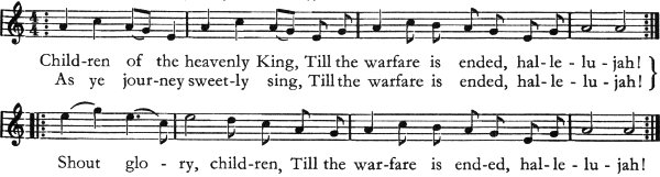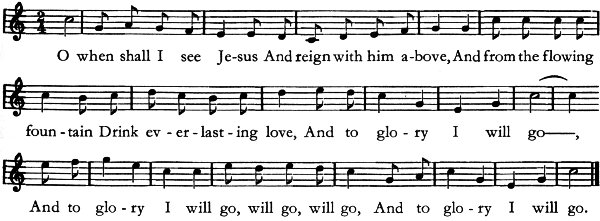 The text simplification in religious folk-songs began modestly. The variety of spiritual song which is closest to the folk-hymn is that in which each short stanza of text (four short lines usually) is followed by a chorus of the same length, as for example: