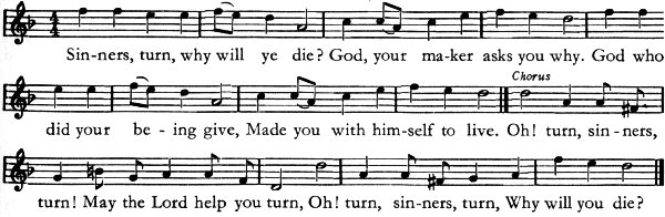A younger variety of song which I include under the heading of religious ballads is that in which the singer tells his story in the first person. Such stories are those of the poor wayfaring stranger just a-going over Jordan, the departing preacher or missionary, a dying boy or girl, and even a pious gold hunter dying on his way to California. The story may be also the plaint of the religious “mourner”, the backslider, and the criminal sinner, or the exultant tale of the saved. Still another group of ballads is aimed more directly at the conversion of the “young, the gay, and proud.” They usually begin by telling the religious experience of the singer and close with a warning as to the tragic results of worldliness and an exhortation to turn from “this vain world of sin.” These songs are quite similar to the worldly ballads in form, and their tunes are, as will be pointed out presently, of the common folk stock.