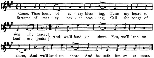 With the spread of this movement to America a fertile soil for its further development seems to have been found. Here it became known as the Great Southern and Western Revival. Here its store of songs, made after the pattern used in England, was greatly enlarged. In fact the masses took the matter of what they were to sing so completely into their own hands that the denominational authorities, especially the Methodists, though they tried to control it, became helpless.[2]