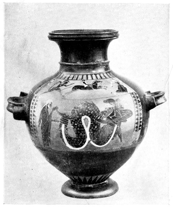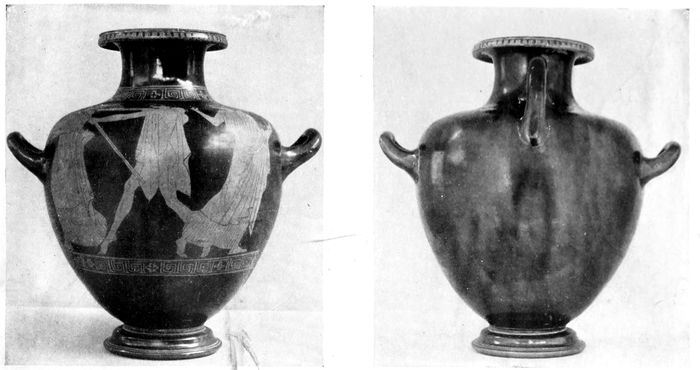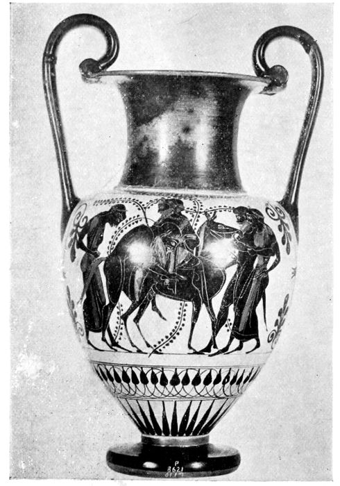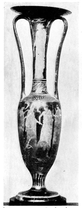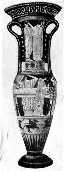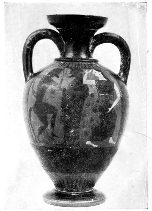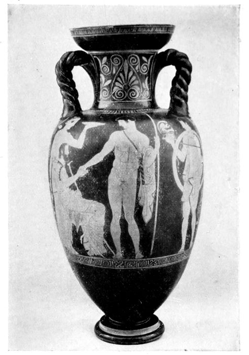 Red-figured amphora with twisted handles, of the first half of the fifth century. There is a decided advance toward slenderness and grace.