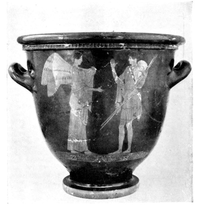 Bell krater, shaped like an inverted bell. This type and the following are characteristic of the red-figured style. Both have handles adapted for carrying the vessel when full.