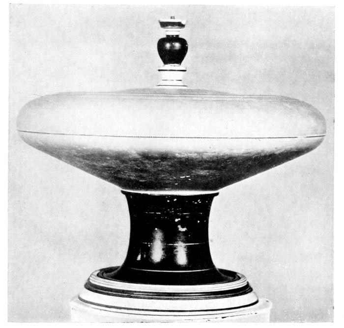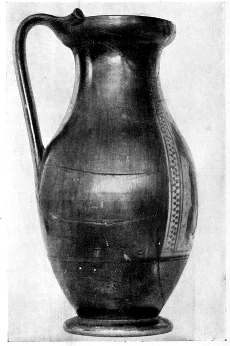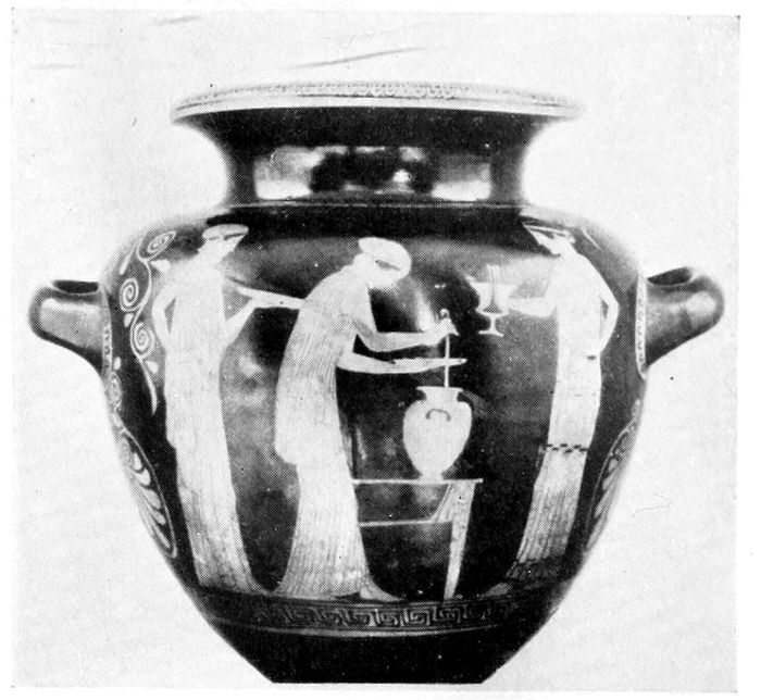 Vase (the ancient plemochoë?), probably used for holding perfumes, a shape intermediate between the pyxis and the lekane. Note the delicately executed knob serving as handle to the lid. In the Museum of Fine Arts, Boston.