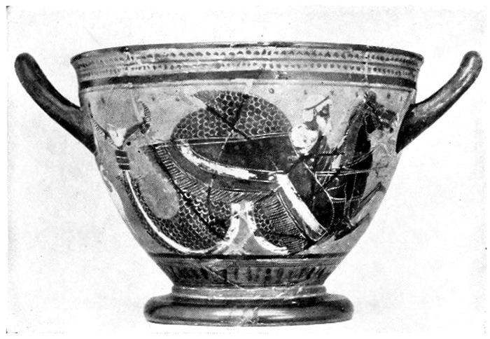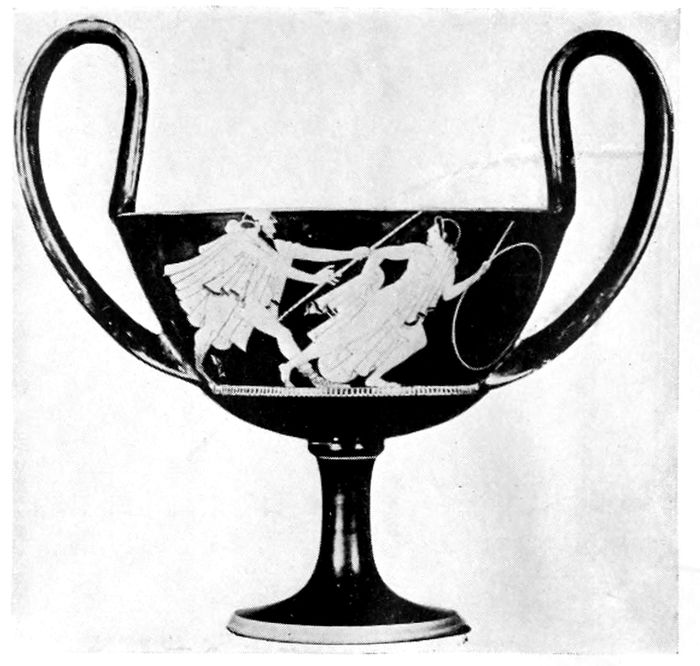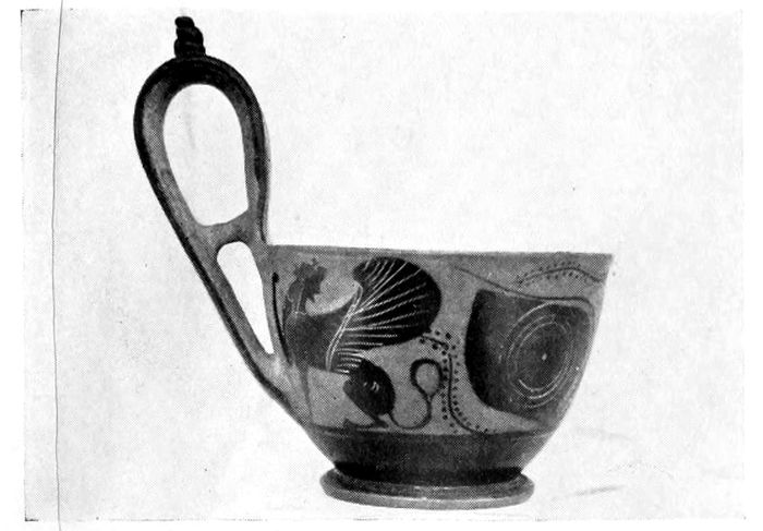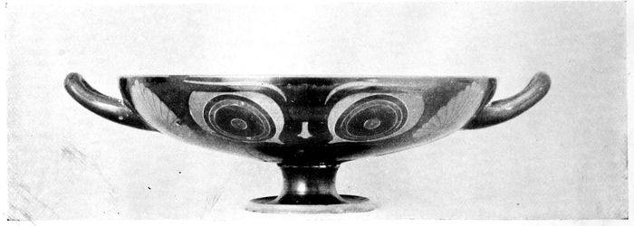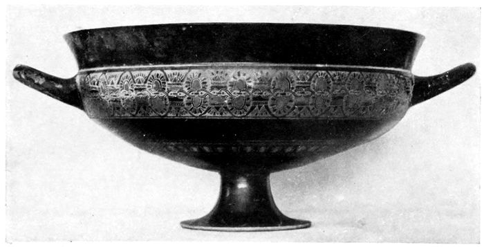 17DRINKING CUPS—KYLIX. The kylix with two handles and high foot was the favorite cup shape of the Athenian potters. The difficulty of decorating the strongly curving surface of the body invited the best efforts of contemporary vase painters.