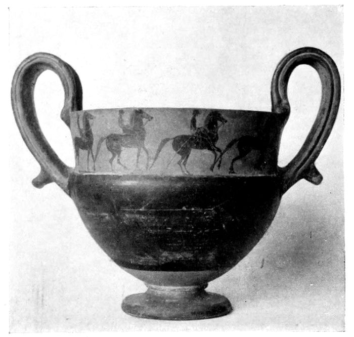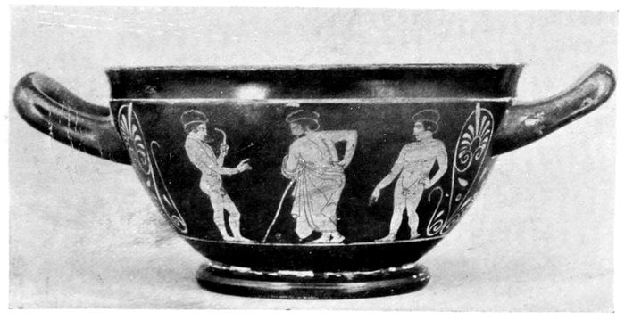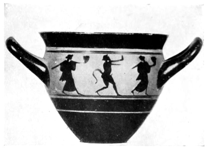 34ILLUSTRATIONS FROM ATTIC VASES. The theory has often been advanced that the painted black-figured and red-figured vases were made for decoration and for votive and funeral purposes but not for actual use. The following illustrations from Attic vases show some of the best-known types in use in the daily life of the Greeks, and thus furnish us with contemporary evidence that the vases were made to serve the purposes for which they are so well adapted.