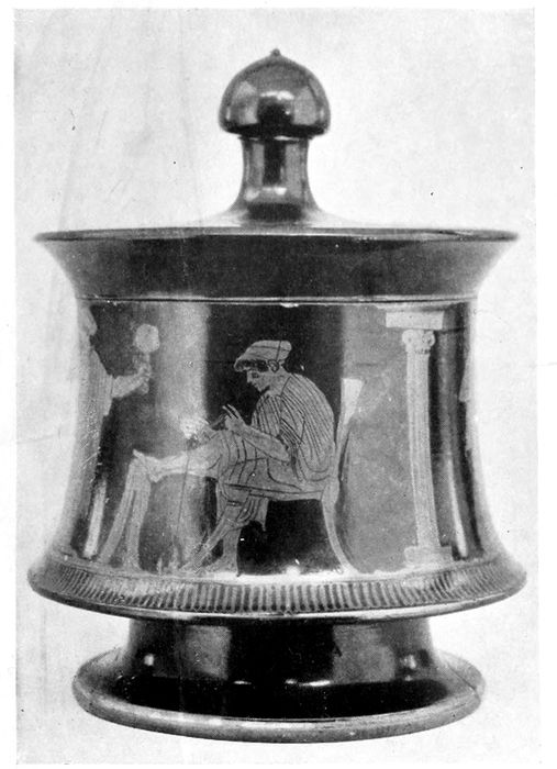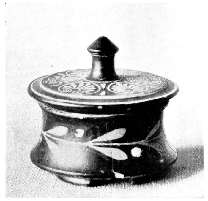31TOILET JARS—PYXIS. Small terracotta box for holding toilet articles. It regularly has a cover provided with a knob or a bronze ring for handle.