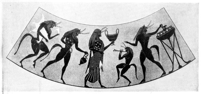 Scene on an Ionic amphora in the collection of the Marquis of Northampton. The god Dionysos and a company of satyrs are drinking and making merry. The wine is in a lebes on a tripod at the right. A satyr is dipping it out with an oinochoë without taking the trouble to use a ladle. Dionysos himself holds up his large kantharos, and the satyr at the left grasps a wine-skin and a drinking-horn.