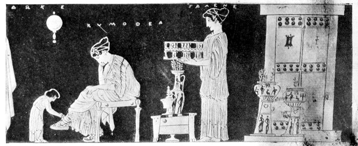 Scene on a red-figured pyxis in the British Museum. A bride is being dressed for her wedding; a little maid is fastening her shoes while another is bringing her jewelry in a box. At the door stand two marriage vases filled with twigs, and a loutrophoros nearby also contains branches or flowers. On a little chest stands a pyxis or perfume vase. A mirror hangs on the wall.
