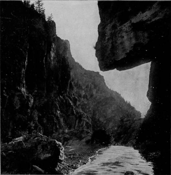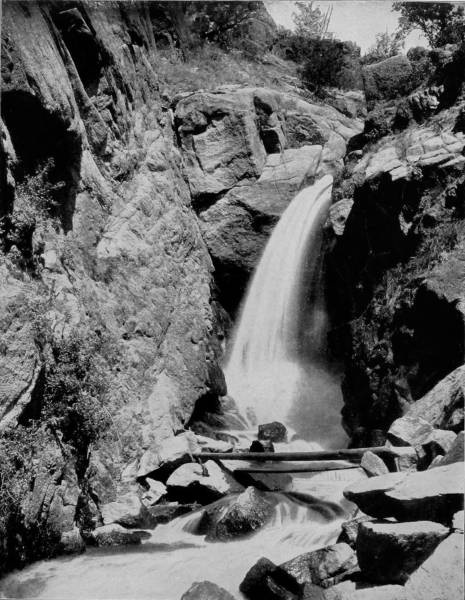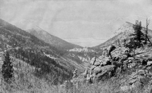 Having taken many views of this famous region, we turned back again to Denver, and from that point of radiation started for North Park. Our route was by way of Boulder, at which place we took the narrow-gauge road for Fort Collins. A few miles from Boulder is Boulder Cañon, a stupendous mountain gorge seventeen miles long, and in places the walls rise to almost the incredible height of 3,000 feet. The falls of Boulder Creek are not without interest, but the mightiness and awful grandeur of the granite cañon weighs so heavily upon the startled perceptions of the spectator, that even the roar of water-fall is scarcely heard, all the five senses being concentrated in that of sight. The eye is set to climbing these terrific precipices of stone; up, up, from niche to niche, from wave upon wave of dizzy height, until it rests upon a world on high that seems to lift its parapets to the sky and bathe its brow in the azure of the heavens. Can it be that the little stream that runs complaining along the ravine has eroded this mighty fissure? No, not this alone, for water has been no more than a servant of other greater forces that have torn the earth into clefts and upheavals. Bursting volcano, denuding glacier, devastating deluge, and cooling fires of internal furnaces that brought a collapse of the earth crust, have all been agencies in this work of mighty disturbance.