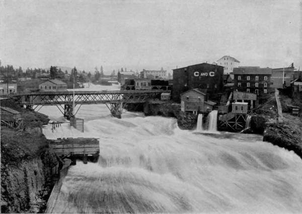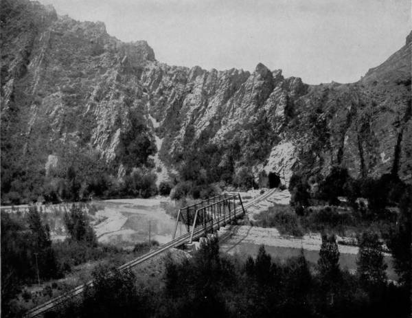 20But we have now reached the backbone of the divide and our train starts down the western grade, circling like a hawk out of the sky. Over immense fills, through deep cuts, across bridges, following a swiftly-flowing stream, until at length we gain the level valley and go dashing away to Graymont, on the way to Idaho Springs and Georgetown. To avoid tunneling in crossing the divide, the railroad winds around the mountain elevations, up a steep grade, over a way that has been blasted out of the eternal rocks, until from away up the lofty sides the traveler may look upon a scene of marvelous beauty and ruggedness that fades into indistinctness miles below. Leaning out of the car window we view a wondrous panorama, and pause directly to bring our cameras into use, that the scene may be caught and held on paper. There on one side of the depths is Devil’s Gate, in close proximity, as it seems, to Bridal Veil Falls, where the clear mountain stream plunges over a precipice of great height to join the gamboling creek that rushes away on its errand hundreds of feet below. There, too, is a spider’s web of steel, eighty-six feet high, that has served as a passage-way for our train across a chasm 300 feet wide, whose bottom can scarcely be distinguished from our lofty eminence; but we see that the track makes a complete loop, and that the road parallels itself, at a constantly increasing grade, no less than three times. All the while that we are winding around and crossing our own track, Georgetown continues visible, but it is dwarfed by the distance to the appearance of a prairie-dog village.