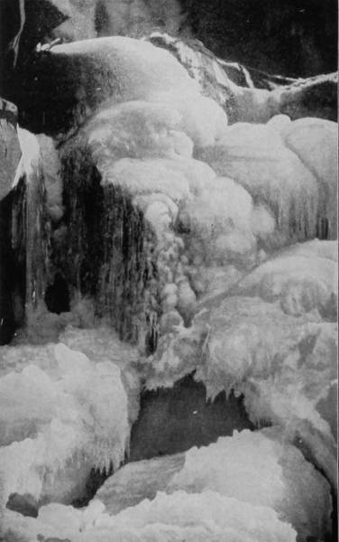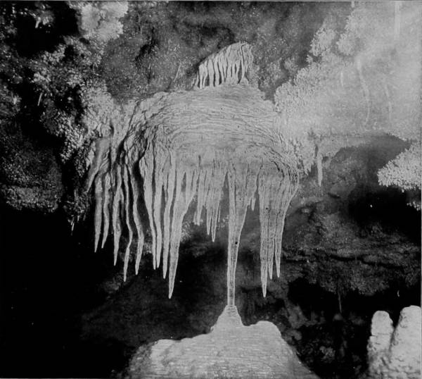 Having concluded our examination of Mammoth Cave, we departed by the Louisville and Nashville Railroad for Louisville, at which city train was taken on the St. Louis Air Line for Wyandotte Cave, which was to be our last objective point in completing our extensive photographic tour of America. This very remarkable Cave, though not so generally known as Luray or Mammoth, is about ten miles south of the Louisville and St. Louis Air Line, in Crawford county, Indiana, and is only five miles from the Ohio River. We reached the Cave by way of Milltown, thence to Corydon, and from that point by private conveyance a distance of eleven miles. Entrance to the Cave is by way of a large opening in a hillside, the aperture being about six feet high and twenty feet wide, through which there is always a strong circulation of air like that noted at the mouth of Mammoth Cave, while the temperature is likewise uniformly 54° Fahrenheit. A short avenue leads into a chamber known as Fanueil Hall, whose dimensions are 200 feet long, 50 feet wide and 25 feet high; thence the route conducts through Twilight Hall into Columbian Arch, which resembles a railroad tunnel, so symmetrical is the excavation. Washington Avenue is next entered, which, followed, brings the visitor to Banditti Hall, where the ceiling rises to an immense height, and the walls are jagged, as is the floor, with protruding rocks, so that this chamber is both forbidding in appearance and difficult to traverse. At this point the main gallery branches, one avenue leading to what is known as the Old Cave, and the other conducting by a longer route to more interesting apartments than those before passed. Through a narrow crevice the visitor gains a room called the Bats’ Lodge, and beyond this is Rugged Mountain, which is in the center of a circular room, where Epsom salts of sparkling purity and vast quantities of gypsum in efflorescent beauty cover the arched vault. Seen under torch-light the effect is indescribably magnificent, and is the first striking intimation which the visitor receives of the extraordinary grandeur to which he will be presently introduced. Following the long route we cross a lovely sand-deposit known as the Plain, but find an abrupt termination of this level walk and are compelled to climb the rock-bestrewn Hill of Difficulty, then squeeze through a small passage-way from which we find present relief by emerging into Wallace’s Grand Dome, one of the most magnificent chambers, as well as the largest, in the Cave, being 245 feet high and 300 feet in diameter. In the center is Monument Mountain, a tremendous stalagmite formation above which is an immense dome beflowered with curling leaves of gypsum that bear a wondrous likeness to the foliage of the acanthus. At the apex of the mountain is a stalagmite one hundred and twenty feet in circumference, which has been broken by some force into three columns, which, viewed from the base, admirably counterfeit three monuments, or ghosts clad in robes of gleaming whiteness, from which fact the chamber takes its name. Visitors are usually treated to a superbly grand sight while examining the splendors of this hall, for the guide disposes his company about the base of the mountain, and ascending to the summit he extinguishes his torch in order to bring the visitors under the influence of dense darkness for a few moments. Suddenly the peak is lighted up with a dazzling splendor, as the guide touches off green, blue, red and orange lights, bathing the chamber in a sea of flaming beauty and bejewelling its lofty arch until Aladdin’s Cave of our imagination is reproduced.