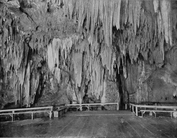 A block of stone that is forty feet long by twenty feet wide is called the Giant’s Coffin, and when viewed from a certain angle the resemblance to a funeral casket is so great that even if attention were not called to it, visitors would hardly fail to be a little shocked by the sight. There is a narrow passage-way around the coffin, which followed leads to a large vault called Gorin’s Dome, in which there are six pits varying in depth from 65 to 220 feet; truly, awful pits to fall into. Notwithstanding the treacherous character of the floor, Gorin’s Dome is one of the finest chambers in the Cave, for it is charmingly festooned and pillared with stalactitic formations. Mammoth Dome, which is at the termination of Sparks Avenue, is probably more interesting, because besides having its walls draped with a marvelous tapestry, the great wonder of the room is immensely increased and beautified by a cataract, which falls from a height of 250 feet and fills the apartment with its musical splashings. The Egyptian Temple, which is a continuation of the Mammoth Dome, contains six massive columns, two of which are quite perfect and eighty feet high by twenty-five feet in diameter. Lucy’s Dome, which is three hundred feet high, is the loftiest of these monster shafts, the equal of which cannot be found in any known cave in the world.
