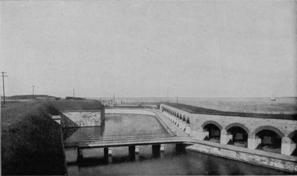 From Fredericksburg our route was northwest to Appomattox and thence east by way of Richmond to Fortress Monroe, on the peninsula. We were a little disappointed to find the site of the culminating event of the war destitute of any special feature of interest of either a natural or artificial character. The scene of surrender is not even marked by a monument, and the country thereabout is a pale and somber stretch of poorly-cultivated lands. Yet there are exceptions; for occasionally the monotony of cabin and broken fence is relieved by prolific tobacco-fields, pretty towns, and inviting manors adorned with colonial houses that still preserve their old-time air of comfort and Southern hospitality. Virginia well deserves the title of the Dominion State, not only because she is the mother of Presidents, but because she is also distinguished as the native state of many of the greatest men and women born on American soil. “To be a Virginian, is to be a gentleman,” has passed into an adage; and the country is proud of her for a hundred reasons, which reference to history will explain. If her soil is not the most fertile, yet her legacy is the richest, for she gave to the world such men as Washington, Madison, Jefferson, Randolph, Clay, Lee and a thousand others whose names and deeds are alike imperishable. Fortress Monroe is reached by the Chesapeake and Ohio Railroad, over which route we traveled from Appomattox. It is located at the point of a peninsula, formed by the Fork and James Rivers, which projects into Chesapeake Bay where it joins the Atlantic. The situation is particularly favorable for a Government fortress, and its natural and commanding advantages have been fully utilized, for it is the largest and strongest fortification in America. Hampton Roads separates the point of the peninsula from the opposite land. This body of water is about five miles wide and forms the outlet of James River. It was in the Roads that the most famous of modern naval battles, between the Monitor and the Merrimac (Virginia), took place, March 9, 1862. Two miles below Fortress Monroe is Old Point Comfort, a very popular resort and the seat of the National Soldiers’ Home. Newport News is nine miles above the Fortress, on Hampton Roads; and Yorktown, the place of Cornwallis’ surrender to Washington, October 19, 1781, is twenty-five miles north, on York River, both places possessing great historic interest for events of which they were the scene during the Revolutionary war.