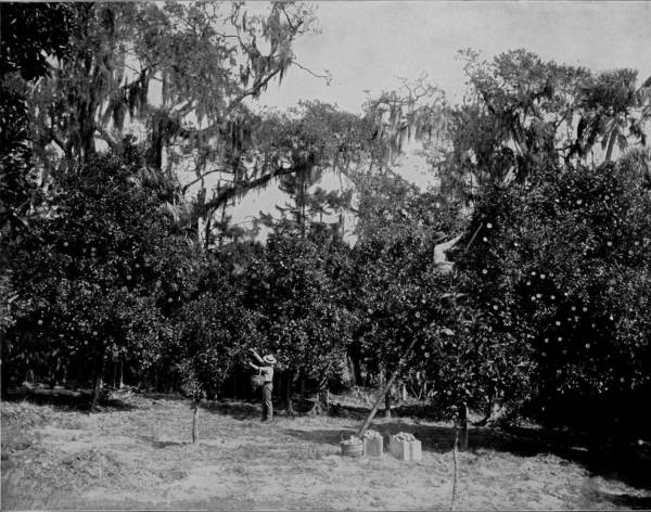 Palatka is a pretty town of 3,500 inhabitants, and situated in the heart of the orange belt. Besides its picturesque surroundings and importance as a shipping point, it is healthfully located on high ground and in the midst of a piney region noted for the blandness of its climate. Florida has been transformed within the past very few years by the Plant railways from a state of comparatively sandy desolation, without roads through its dense growths, into a country of great advantages and thriftiness. Fruit trees have supplanted the coverts of palmetto, and there is health and prosperity abounding everywhere. The “Florida Cracker,” as her languid, backwoods, one-gallus type of slovenly, slow humanity is called, has not yet wholly disappeared, but the transition to more industrious and cultured citizenship is going on, and it is particularly apparent about Palatka. The old-time conveyance of an ox in shafts hitched to a cart of uncertain age is not quite obsolete, but it survives more as a relic than as a thing of every-day service; and people who visit Florida on a winter trip, people in fine linen who are able to fare sumptuously, are more given to using the ox-cart, than are the permanent inhabitants. In the mountain districts of Colorado tourists ride burros; in Florida they affect a preference for the harnessed ox. It is the influence of locality that diversifies custom. Another curiosity in Florida, peculiar alike to Cuba and the tropics generally, is the palmetto hut, an unsubstantial structure roofed and “weather-boarded” with palmetto leaves, but which furnishes protection from the sun and rain. These huts are usually built to serve as temporary abodes for orange-pickers, and are therefore usually within or near the groves. Throughout Florida it is the custom to sell the orange crop on the trees, the purchasers being fruit dealers from the North. These dealers employ trained pickers, who work throughout the season, going from one grove to another, until the gathering is completed; usually they provide their own supplies, likewise their shelter, and the palmetto hut serves them both well and economically. When the fleas become so thick as to crowd the occupants, they burn the hut and build another. It is the cheapest way yet discovered of getting rid of these elusive pests.