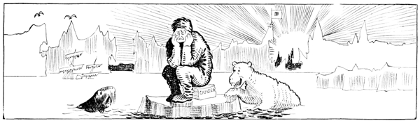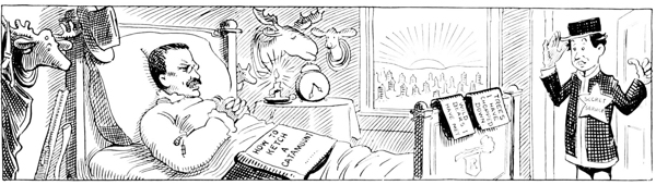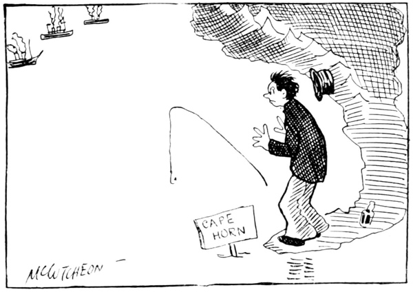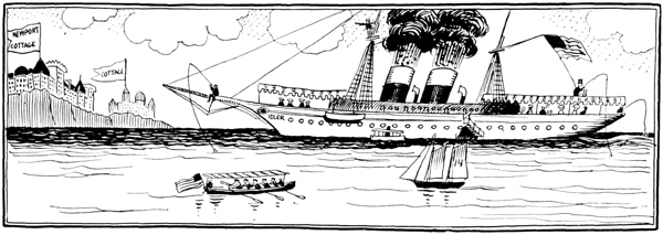 Fortunately, the weather was fine. The sun shone warmly and the sea was calm. Under these favoring conditions it was only a few days until the headlands of the Azores were sighted off the port beam. Hunger and fatigue racked the governor, but he did not stop. He shouted “Courage, my noble steed. The way is long, but we shall soon be there.” One of the colonels was revived by the cool water, and from his position amidships passed the days pleasantly in watching the wonderful dwellers of the deep as they darted hither and thither alongside. On the thirty-fourth day the governor sighted a low group of islands off to the s’uth’ard. He sniffed a moment. “The Bermudas,” he said. And he was right. They were the Bermudas where the onions come from. From this point he shaped his course nor by nor west, intending to land on American shores about four miles west of Oyster Bay. But he was thrown out of his course by adverse currents and strong head winds, and had to make his landing six miles east of Oyster Bay. Still he was not discouraged.