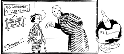 “Whose little boy are you?” “I’m Uncle Sam’s little boy.” “Where are your parents, my lad?” “Papa’s doing ten years with the late Mrs. Bishop and mamma, I understand, is married at present to Mr. Bridgeport. Her contract expires some time next month, though, she having failed to get a renewal. Mamma’s getting old, you know.”