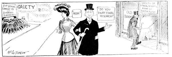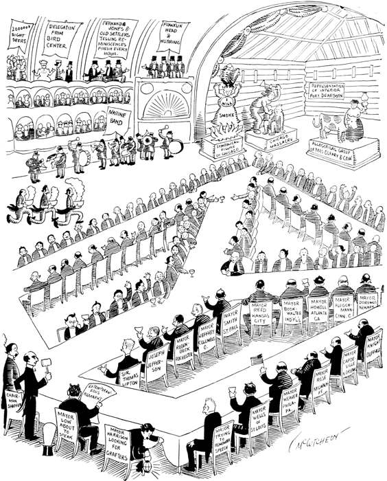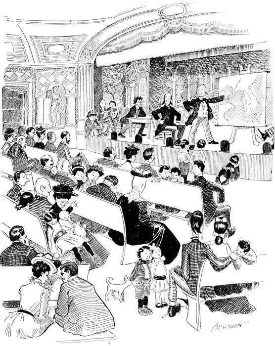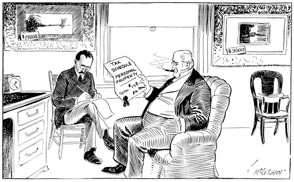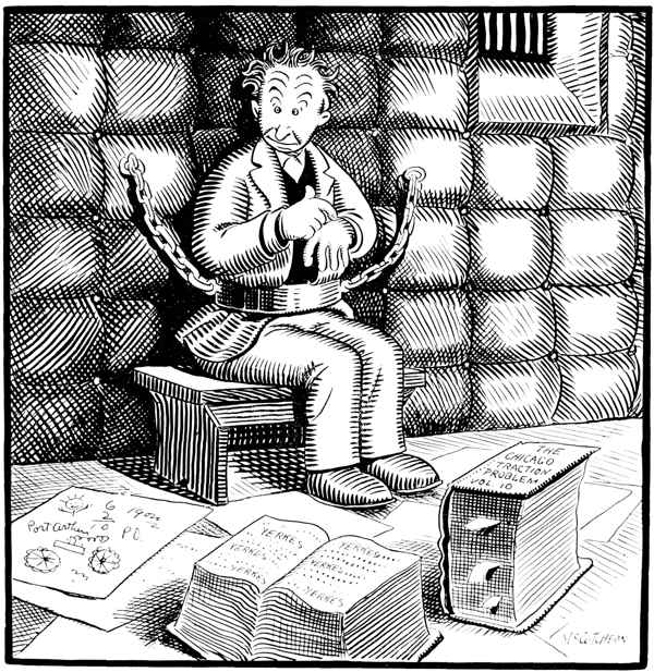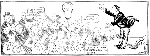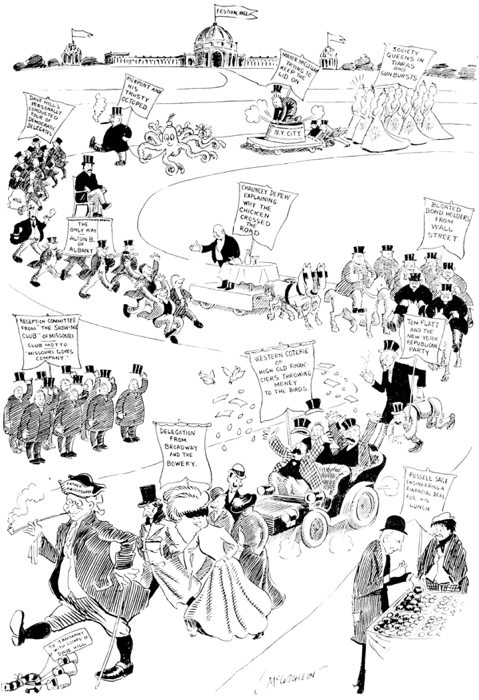 “I’ve made a careful study of the Traction Question, and if you hold real still I’ll tell you the answer. If you think it over as carefully as I have you’ll soon know just as much as I do. I used to get up at three o’clock and sit in the dark thinking it out. I didn’t dare light a light for fear Mr. Yerkes would find me and sell me some stock. Finally, one morning, about half-past four I got it all thought out except where the stockholders come in, and just then Mr. Yerkes and Mrs. Chadwick rode in on two white giraffes with a trunk full of stocks. So I ran down the street yelling, and some one suggested a nice, quiet upholstered room where I would be safe. So I came here and you mustn’t tell Mr. Yerkes where I am. And now I’ve got it all thought out. You first have to multiply Port Arthur by the new Chicago Post Office and carry two. Then you subtract and let stand in a cool place until you become impatient, and that’s the answer.”