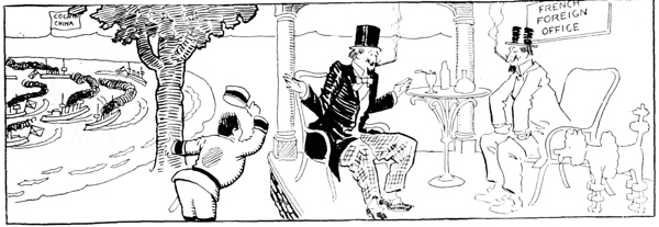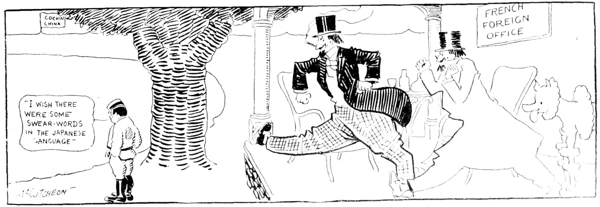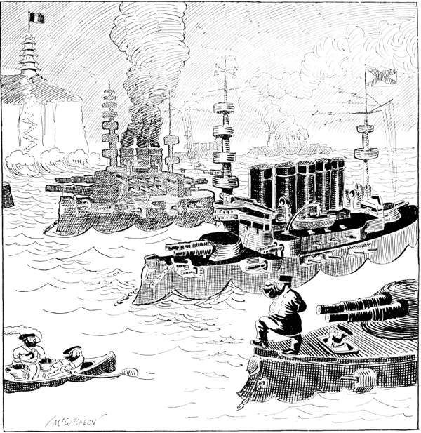 Admiral Rojestvensky stood musingly on his flagship—“One load more,” he muttered sadly, “and then our fleet will be coaled and I must leave this pleasant coast.” For a moment a tear stood in his eye as he peered off toward the French China shore. The thought of leaving the dear old scenes, to which he had become so greatly attached, made even the stern old sailor weep. Dashing aside the tear, he turned to direct the busy crew who were bringing the coal to the ships.