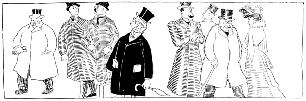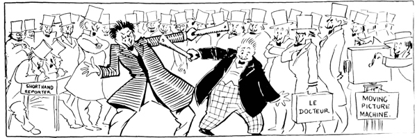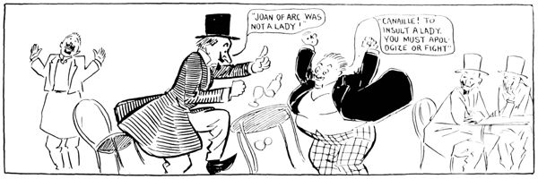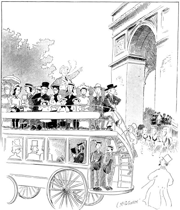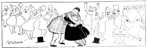 Paris never was more beautiful, even although we understand that most of the society people have gone away for the summer. You can’t help pitying these Europeans, for they can’t go abroad for the summer, being already there. Went out to visit the Morgue to-day. Busiest place of its kind I’ve ever seen. Visited Napoleon’s tomb this afternoon, and consider it a most imposing place. Mr. Figgey tells us that the departed is a relative of the new United States Secretary of the Navy, a fact which has aroused great interest in our midst. Yesterday we drove out to witness the Arch of Triumph, which was greatly enjoyed by all save Ernest Pratt, to whom Europe is an old story, he having been here before. To-morrow we go out to view Père la Chaise, the famous cemetery of Paris. It is said that many well-known Frenchmen and French women sleep their last sleep out there, so we have cautioned Gus Figgey to put on the soft pedal for a short spell. Ernest Pratt says Abelard and Hèloise lie there, but whether they are two people or a firm I cannot state. Visited the Louvre yesterday and saw the Venus of Milo, which greatly shocked Elmer Pratt. Gus Figgey says her arms were guillotined during the French Revolution, but be it as it may, she certainly is shy on arms. Orville Peters and Wilbur Fry are eager to get to Venice to while away the hours with dulcet strains from their mandolins, but Ernest Pratt says, “Wait till we see Saint Peter’s.” To-morrow we view the Catacombs and the Cemetery of Montmartre.