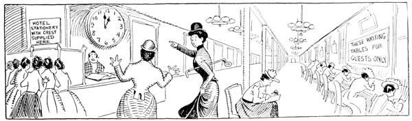 Last night we engaged some gondolas and did the grand canal. The moon was divine, and the whole city was throbbing with music and sentiment. Mr. Figgey directed the excursion and after a while took charge of the oar or paddle (I don’t know what the real name is) and gave the gondolier some lessons in the work. Smiley Greene sang some rollicking hymns, and then we all clamored for Orville Peters and Wilbur Fry to play on their mandolins. They had carried their instruments all the way from Bird Center and had counted the seconds to the present moment. But scarcely had they begun to play before some men came and said it was not permitted for outsiders to play on the canals. Only those belonging to the Gondoliers’ Union could play. Orville and Wilbur were broken-hearted. We had been out for some time before we discovered that Riley Peters and Myrtle Prute were missing, but, Mr. Figgey soon located them in a gondola by themselves. Riley seems to be in earnest this time, but now could any one help being in earnest, and in love, in Venice. Even all of us become a little bit soft here—even us old married people. Flossye Niebling has been spending all her time writing letters home. The stationery at the hotels is so attractive and she doesn’t want to miss a chance to use it.