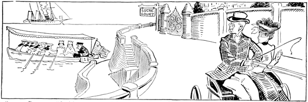 At last we are in the well-known city of Venice, Italy, about which our fancies have from time immemorial woven the most bewitching dreams. It is hard to realize that we are really here. We instantly exclaim, “Can it really be true that we are in Venice, and not merely dreaming.” Mr. Figgey—he’s so funny—says that we’ll not think we’re dreaming when we get our hotel bill. Mr. Figgey is so material in his attitude of thought, but he has been a perfect dear in arranging things. He doesn’t let us rest a moment, and even now, when we have been here only two days, he seems to know all the gondoliers and everybody in town knows him. He calls all the gondoliers “Louey,” and they begin to grin broadly whenever he comes in sight. We had such a good joke on Elmer Pratt to-day. We came across a little church near the hotel and Elmer went into raptures over it. It’s whole façade was one bewildering nightmare of scroll work and curly cues, like frosting on a wedding cake. Elmer said that he considered it the most beautiful thing he had seen in Europe, and at once looked it up in our Baedeker. The description says that it is the most atrociously ugly building in Europe, and since then Elmer has not admired anything until he has looked in the guide book to see whether it is beautiful.