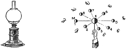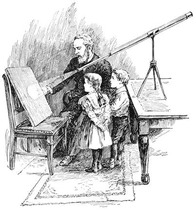 The brightness of the sun is among the most wonderful things in nature, and there are three points that I ask you to remember, and then indeed you will agree with Milton, that the sun is “with surpassing glory crowned.” First think of the beauty and brilliancy of a lovely day in June. Then remember that all this flood of light comes from a single lamp at a most tremendous distance; and thirdly, recollect that the sun is not like a bull’s-eye lantern, concentrating all his light specially for our benefit, but that he diffuses it equally around, and that we do not get on this earth the two-thousand-millionth part of what he gives out so plenteously! When we think of the brightness of day, of the distance from which the light has come, though Nature has not adjusted any vast lenses to direct10 the light specially in our direction, we begin to comprehend the sun’s true magnificence.
