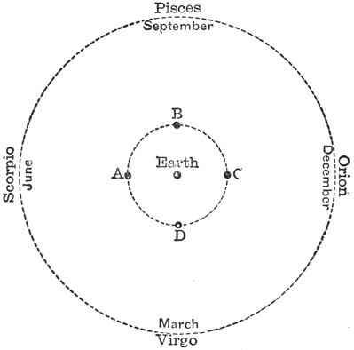 We may, however, specially remind the beginner that the objects on this map are not always to be seen, and as an illustration of the way in which the situation and the visibility of the constellations are affected by the time of year, I shall take the case of the Pleiades and follow them through a season. Let us suppose that we make a search for this group at 11 P.M. every night. On the 1st of January, the Pleiades will be found high up in the sky in the southwest. On the 1st of March, they will be setting in the west at the same hour. On the 1st of May, the Pleiades are not visible, neither are they on the 1st of July. On the 1st of September, they will be seen low down in the east. On the 1st of November, they will be high in the heavens in the southeast. On the ensuing 1st of January, the Pleiades will be found back in the same place which they occupied on the same date in the preceding year, and so on throughout the cycle. Of course, you will not suppose that their changes are due to actual motions in the group of stars themselves. They are merely apparent, and are to be explained by the motion of the earth round its axis, and the revolution around the sun.