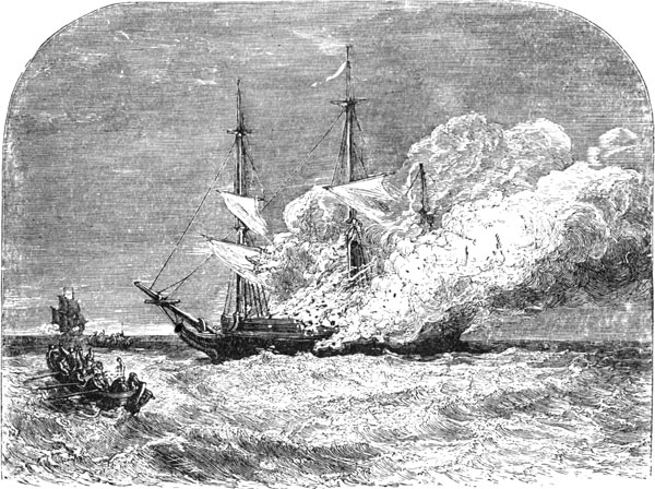 Da rief der wachthabende Matrose: »Schiff in Sicht!« Wir eilten aufs Verdeck und sahen wirklich ein Schiff gerade auf uns zukommen, denn es war windstiller geworden und das kalte Polarwasser strömte uns entgegen. Wir riefen dem Fahrzeuge zu, rechts auszuweichen. Aber niemand ließ sich auf dem fremden Schiffe[Pg 188] sehen und hören, dessen ganzes Aussehen einer Ruine glich. Der Hauptmast war in der Mitte abgebrochen, an den Raaen hingen hier und da Segelfetzen, wie etwa an der Stange einer alten Regimentsfahne, die oft ins Kartätschenfeuer gekommen ist. Die andern Masten fehlten, die Schiffsplanken schienen gewaltsam in die Höhe gedrückt, am Steuer hing ein großer Eisklumpen, auf dem Verdeck lag tiefer Schnee, und doch glaubten wir am Mast eine menschliche Gestalt zu entdecken, die nach uns herüber sah. Wir riefen, schossen eine Kanone ab; alles umsonst. Nichts regte sich auf dem Geisterschiffe, das auf uns zukam, als wollte es uns in den Grund bohren. Den Matrosen ward unheimlich zu Mute; aber meinen Neffen und mich reizte die Neugier, zu erfahren, was es mit diesem Selbstsegler für eine Bewandtnis habe. Das Boot wurde langsam niedergelassen und dann nach dem rätselhaften Schiffe gerudert.