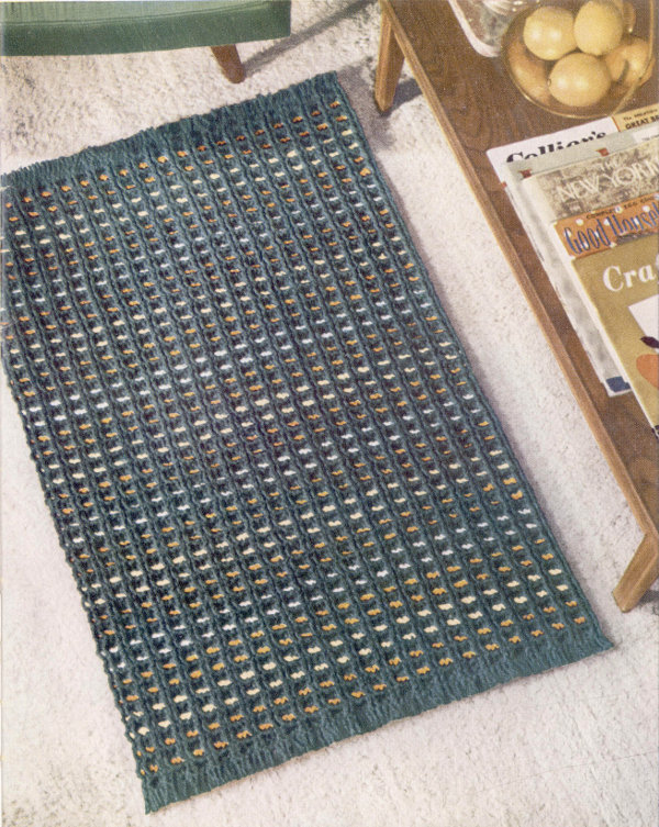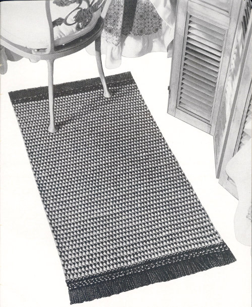 4th Row: S c in ch 1 space, * ch 1, s c in next ch 1 space, repeat from * across row, ch 1, insert hook in last st, pull loop through, drop Black, pull Green through both loops on hook, ch 1, turn. Repeat 2nd, 3rd and 4th rows, until rug measures 40 inches, ending with the Black row, cut yarn.