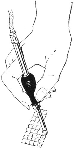 PUNCH NEEDLE RUG—By this method, the yarn is threaded in a special hooking needle. The needle is then punched through the rug foundation from the wrong side in accordance with the color pattern indicated by the stamped design.