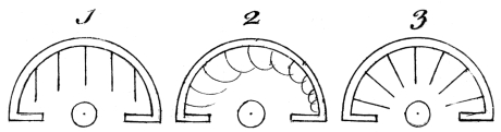 “For, says he, having observed (in electricity) that light bodies, placed near any part of the rubbed cylinder, seemed to be equally attracted, I contrived a semicircle of wire, which I could fasten at a constant distance, making it encompass the upper semi-cylindrical surface of the glass, at 4 or 5 inches distance. This wire had several pieces of woollen threads fastened to it at pretty near equal distances. The length of them was such, that being extended in a direction towards the center of that imaginary circle, on the surface of the glass, in the plane of which the wire was placed; they would then reach within an inch of the circumference of that circle: but if left to their own liberty, they hung in that parallel portion represented, fig. 1. The cylinder was placed with its axis parallel to the horizon; and in this posture, it was turned swiftly round; and then by the rapid motion and agitation of the surrounding air, the threads were placed into such portions, as are expressed fig. 2. viz. they were all lifted up and bent upwards from the axis of the cylinder.