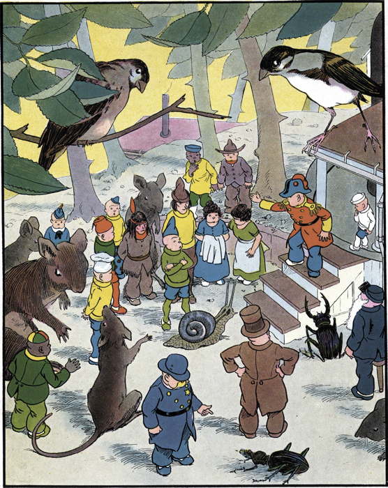 Several of the Teenie Weenies ran to the old derby hat which served the little people as a school house and armory, and began furiously to ring the tiny bell. All the birds and animals who lived near the little village knew that when the bell rang long and loud it was a signal for them to come. In a few minutes, two birds flew under the rose bush where the village stood and one by one, several mice, a squirrel and a couple of intelligent-looking bugs appeared.