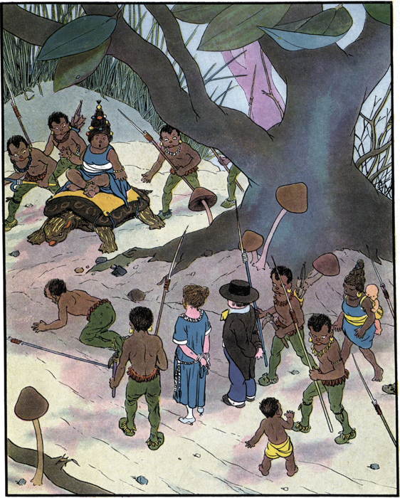On the appointed day the General set off for the dance with a number of the Teenie Weenies, and as they drew near the village they were met by a body of wild men who had been sent out as a guard of honor to escort the General into the village. He was led to a spot beneath a big bush where the Queen sat cross-legged on a wonderfully soft piece of cloth which had been thrown on the ground. Over her head hung another cloth which was fastened at the four corners to long poles held in the hands of four wild men.
