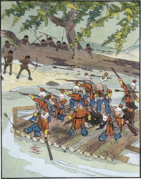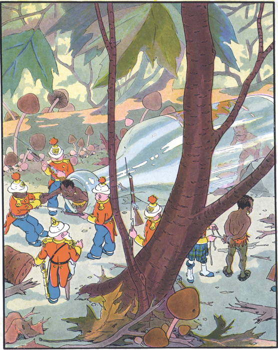 “O, great chief of the thunder wagon (the name, “Men of the Thunder Wagon,” was given to the Teenie Weenies on account of the cannon which the wild men said sounded like thunder), we have come here to ask for peace. We do not wish to fight; we ask only for the liberty of our brothers whom you hold prisoners. Give us back our brothers and we will return the Lady of Fashion and the Poet to you. We will also give you two hundred smoked frog hams for our brothers’ return.”