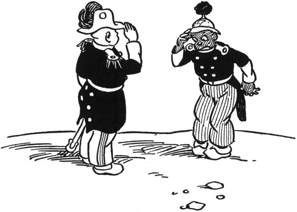 When the review was over there was much hugging and kissing and some crying, for most of the little women shed a few tears of happiness, but that’s a strange way women folks have of showing they are happy. One old hen cried so hard she had to be led away. A duck insisted on kissing the Dunce and a mouse hugged Paddy Pinn so hard it nearly broke his arm.