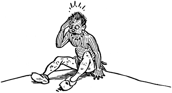 After the dance a great fire was built and when a heap of hot ashes had burned, the wild men wrapped several frog hams in sassafras leaves and put them into the hot bed of ashes to roast. When the hams were cooked they were cut into slices and served to the Teenie Weenies and the wild men. Wonderfully delicious rice cakes were also served and the Teenie Weenies ate until they were quite filled. The greedy Dunce ate so much he became quite ill and had to be carried back to the Teenie Weenie camp, where the Doctor was kept busy most of the night putting heated buttons on his aching tummy, until the pain was gone.