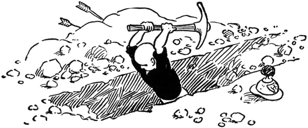 “Crickety!” exclaimed the Dunce when he saw the litter, “I wish I was wounded so I could ride in that instead of walkin’ all the way home.”