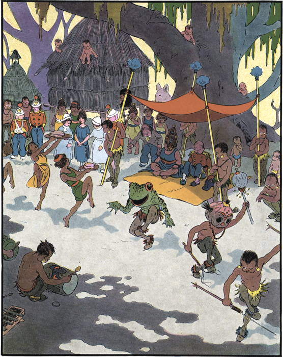 Instantly a number of voices broke into a loud song from behind a house near by and presently the dancers came hopping and prancing into the cleared spot before the Queen. First came a warrior with a long spear and when he danced directly in front of the Queen he broke the spear in two over his knee. Next came a man with a queer seed pod over his head and in one hand he carried a whip with which he struck the warrior every now and then. In the other hand he carried a dried seed pod which rattled loudly in time with the song. The next dancer wore a frog’s head and hopped in time with the music, much after the fashion of a frog. Several girls followed the frog man, carrying plates of smoked frog ham and rice cakes.